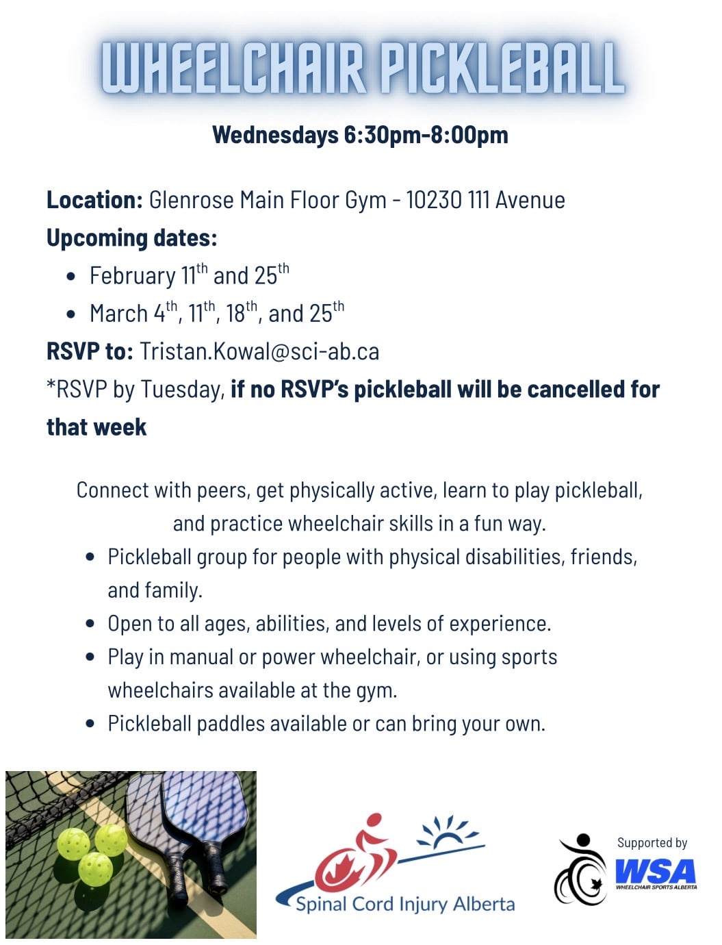 Pickleball group for people with physical disabilities. Friends & family are also welcome. Open to all ages, abilities, levels of experience, and mobility aids. Can play in manual or power wheelchair, using other mobility aids, or using sports wheelchairs available at the gym. Pickleball paddles also available or can bring your own. Have fun, socialize, get physically active, learn to play pickleball, and learn and practice wheelchair skills through pickleball games.